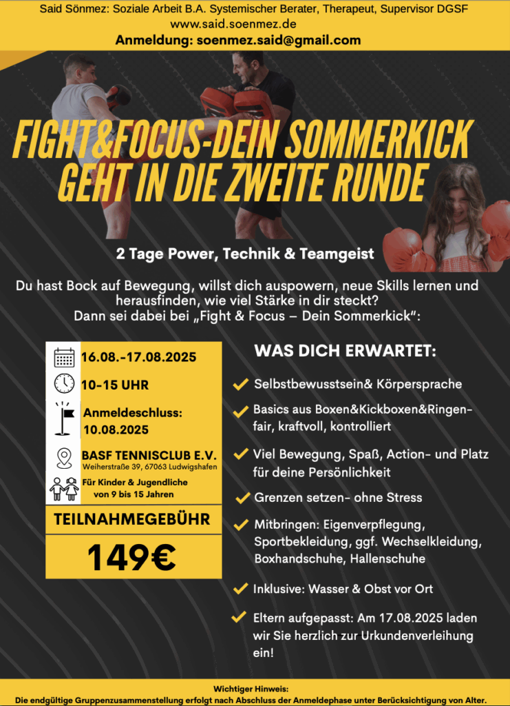 In zwei intensiven Tagen erwarten dich Power, Technik und Teamgeist. Du lernst Basics aus Boxen, Kickboxen und Ringen â fair, kraftvoll und kontrolliert â und stĂ€rkst dabei dein Selbstbewusstsein und deine Körpersprache. AuĂerdem gibt es jede Menge Action, SpaĂ und Raum fĂŒr deine Persönlichkeit.