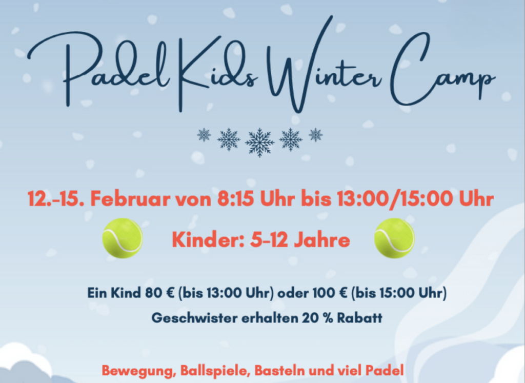 | Liebe Mitglieder, von 12. bis 15.02. findet auf unserer Anlage ein Padel Camp für Kinder statt. Dabei stehen Bewegung und Spaß im Vordergrund. Auf dem Programm stehen Bewegungs- und Ballspiele, Basteln und Padel. Teilnehmen können Kinder im Alter von 5 – 12 Jahren Das Camp findet von 08:15 Uhr bis 13:00/15:00 Uhr statt Die Kosten für die Teilnahme liegen pro Kind bei 80€ (bis 13:00 Uhr) oder 100€ (bis 15:00 Uhr) Geschwister erhalten einen Rabatt von 20% Zur Anmeldung oder bei weiteren Fragen wendet euch bitte direkt an Marc Bardés unter: +49 177 720 566 0, oder unter info@padelbaseludwigshafen.de Wir wünschen den Kids viel Spaß! |