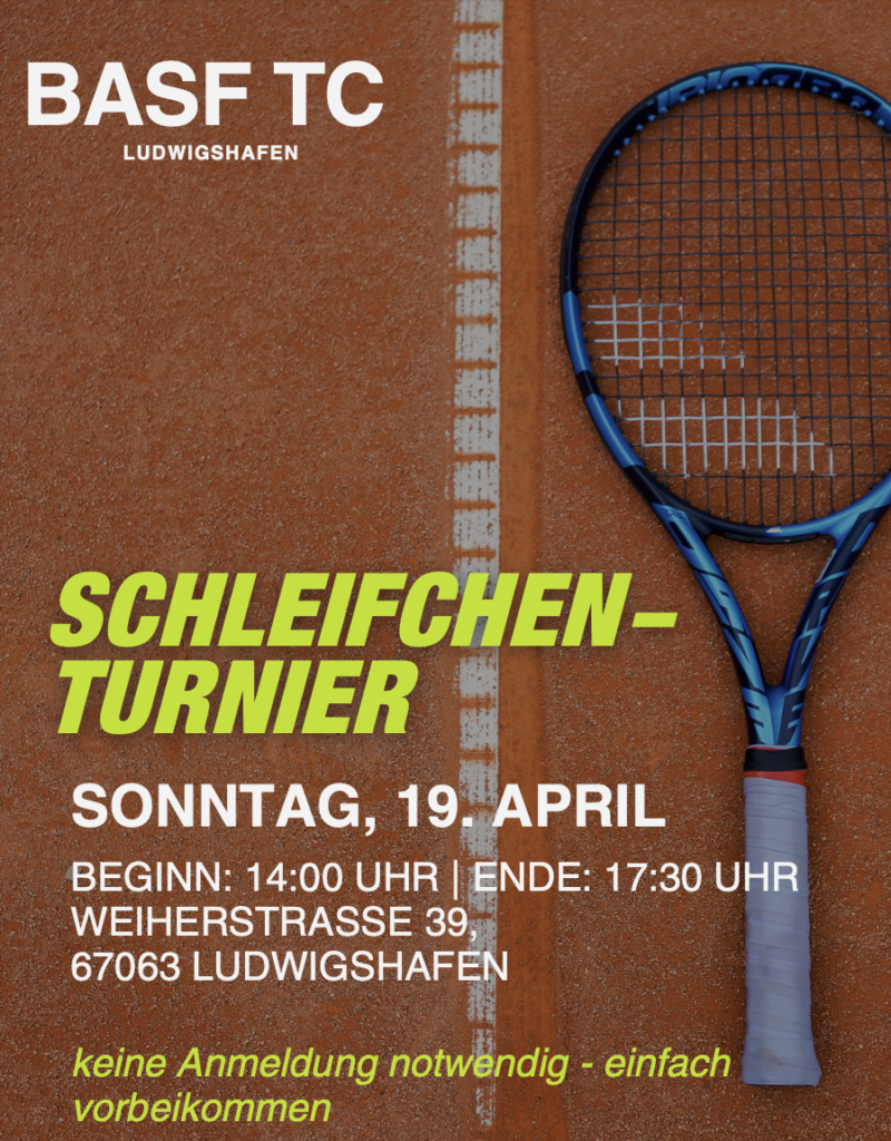 am Sonntag, den 19.04.26 findet ab 14:00 Uhr bis 17:00 Uhr unser Schleifchenturnier auf den PlÀtzen 6/7/8, 9/10/11, 14/15/16 zur Saisoneröffnung statt.